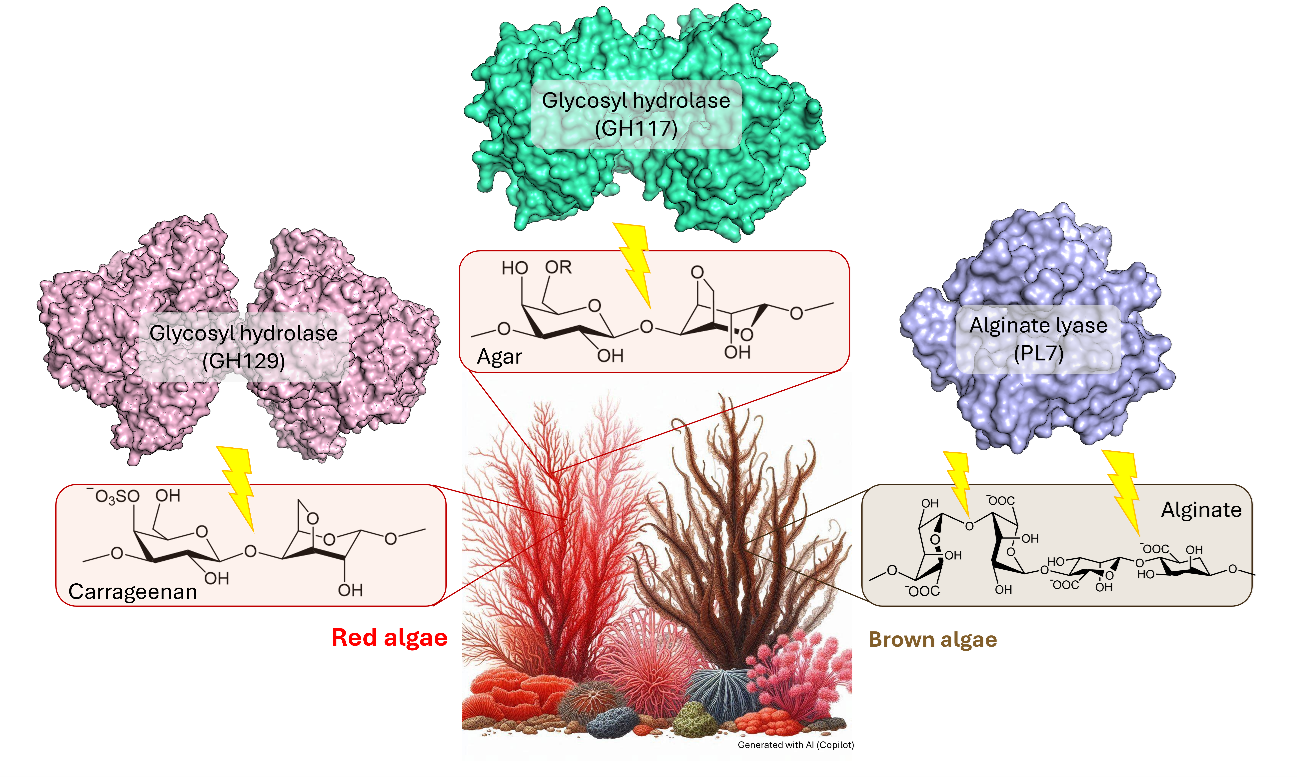 The structures of key enzymes (glycosyl hydrolases and alginate lyase) involved in degrading the polysaccharides (agar, carrageenan, and alginate) from red and brown algae.