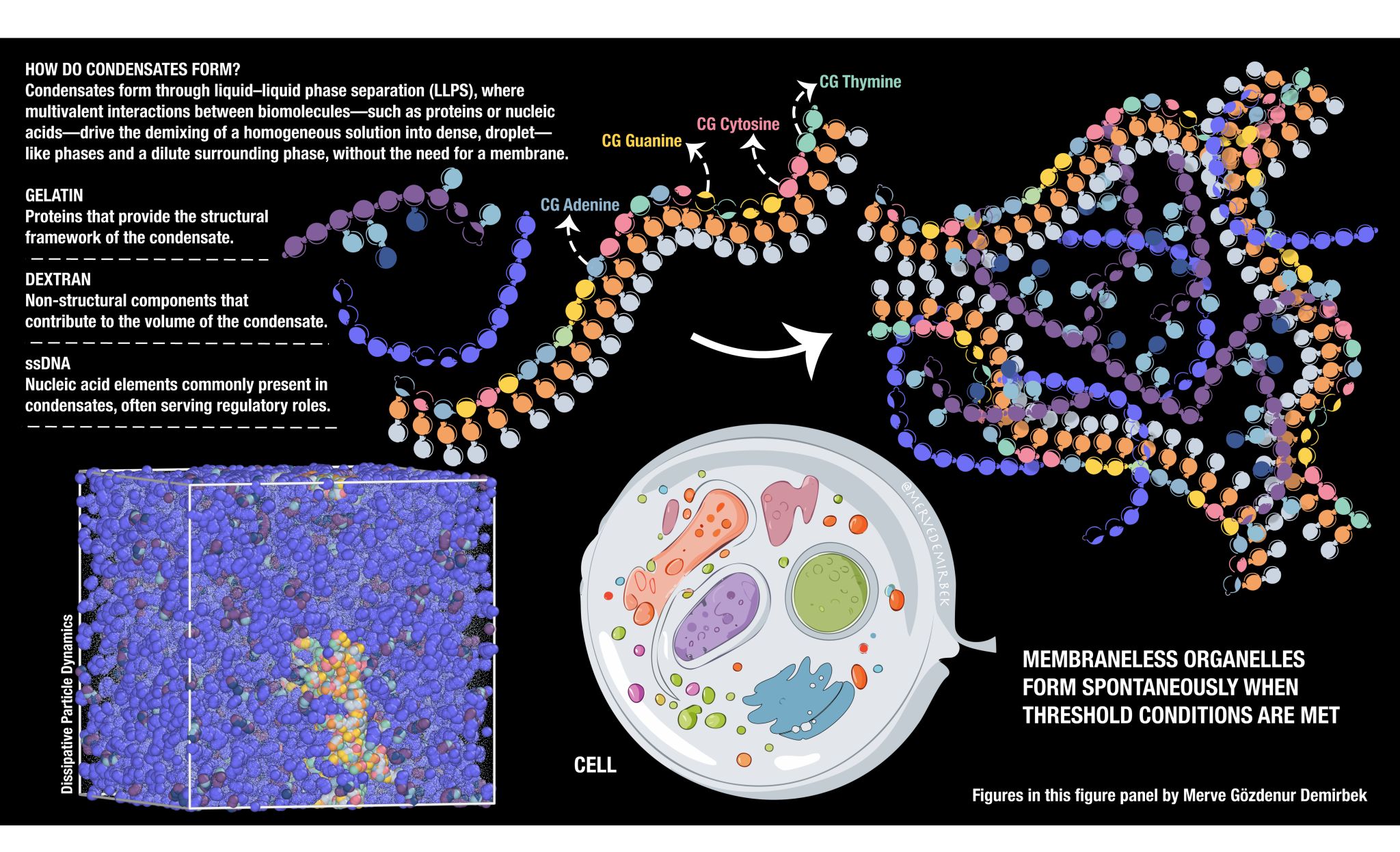 The team used Dissipative Particle Dynamics (DPD) simulations to explore the formation and behaviour of MLOs under biologically relevant conditions. Particularly, they modeled coarse-grained single-stranded DNA (ssDNA), gelatin (representing a protein component), and dextran (representing a polysaccharide) to replicate the complex nature of MLOs. The main objective of this project is to create a flexible and scalable toolkit with MARTINI3 within a DPD framework to study complex biological phenomena and phase behaviour at mesoscale resolution.