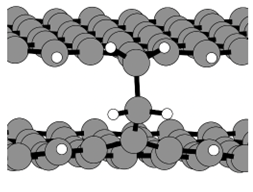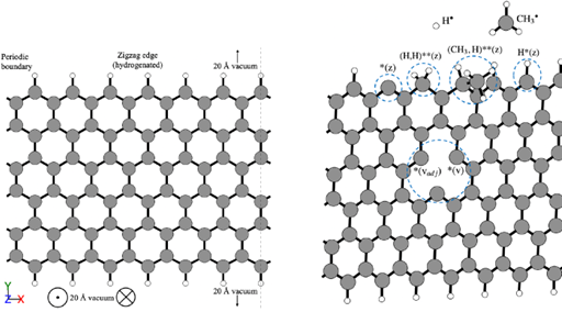 📸 The images show (1) graphene flakes modelled in the simulations, fully saturated (left) and with presence of defects (right), (2) Cross-linking formation between graphene flakes