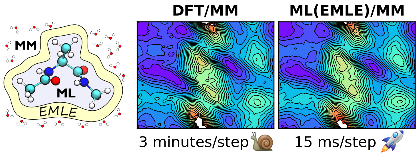 📸The right panel shows the free energy landscape of the alanine dipeptide obtained by DFT/MM and EMLE/MM. Both landscapes are virtually indistinguishable, while the computational cost is 4 orders of magnitude lower (3min/step VS 15ms/step) with the EMLE model.