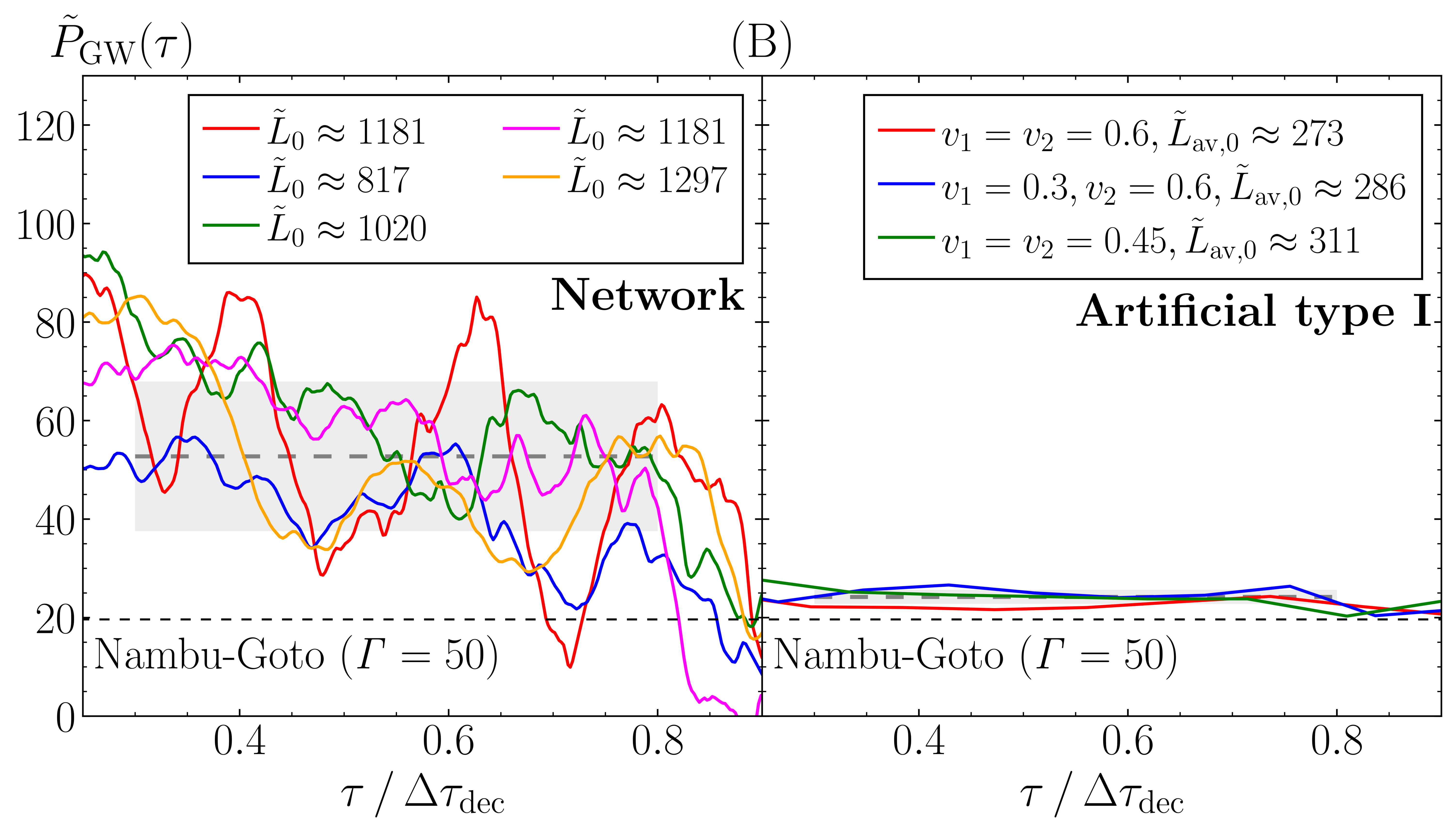 The strings have an external (long) structure, which accounts for GW decay, and an internal structure, which accounts for particle emission and is typically neglected. However, for accurate predictions of the GWB, both structures must be considered to account for both emissions and require precise simulations.