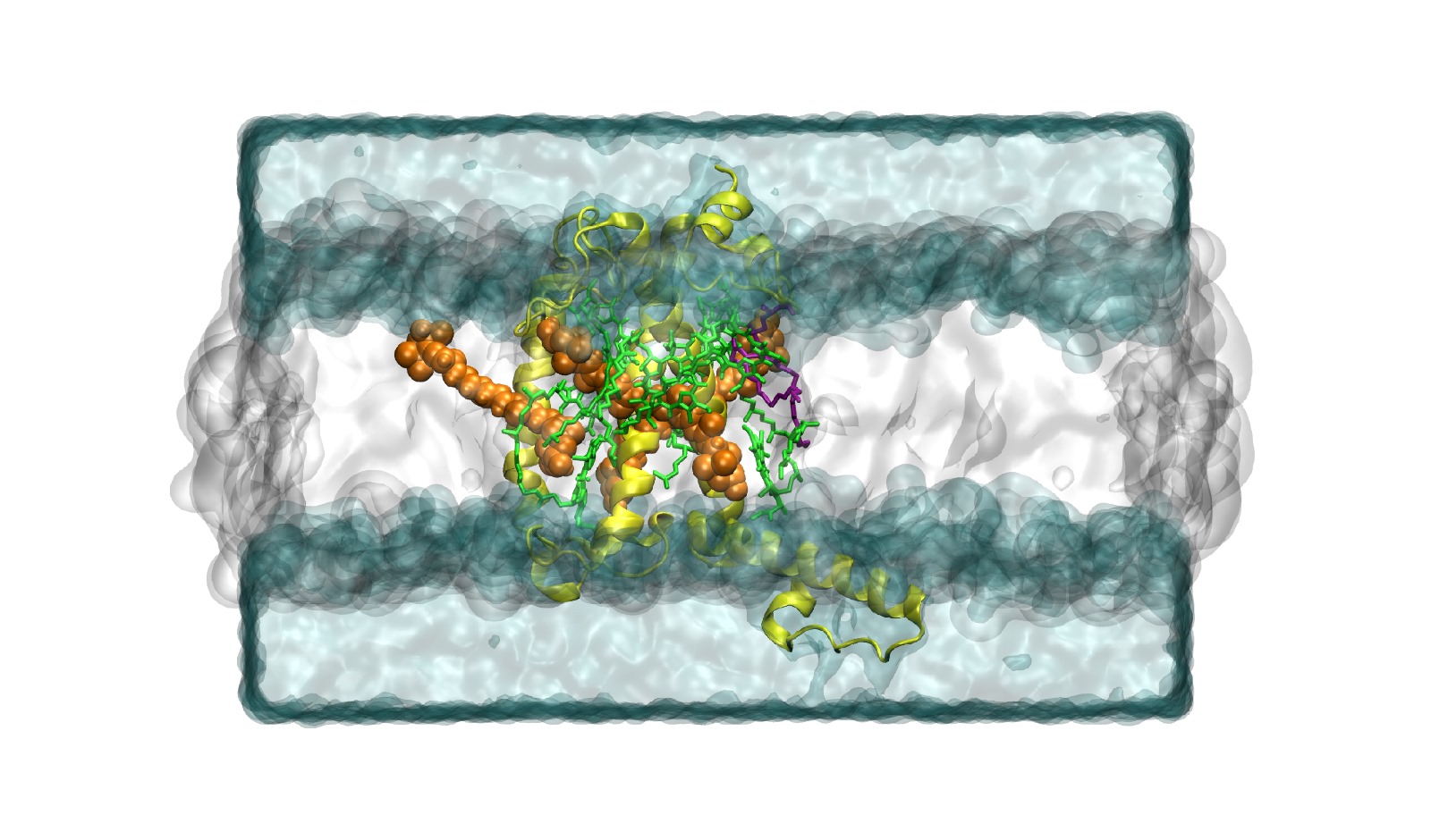 📸 The image below shows an atomistic molecular dynamics simulation of the photoprotection trigger in green algae stress-related LHCs that is embedded in a photosynthetic membrane and solvated with water.